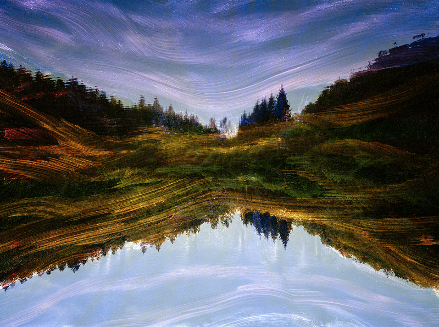 Ik fotografeer landschappen waarbij ik het Amsterdamse ecosysteem en daarop aansluitende natuur als uitgangspunt neem. Vervolgens bewerk ik mijn middenformaat fotonegatieven met vloeistoffen zoals inkt. Er ontstaat een wonderlijk spel, dat uitstijgt boven een geëconomiseerde of lineaire kijk die in strijd zou zijn met een holistische visie op natuur als bron van leven. En een concept van dualiteit (tijdelijk of tijdloos) overbrugt.
